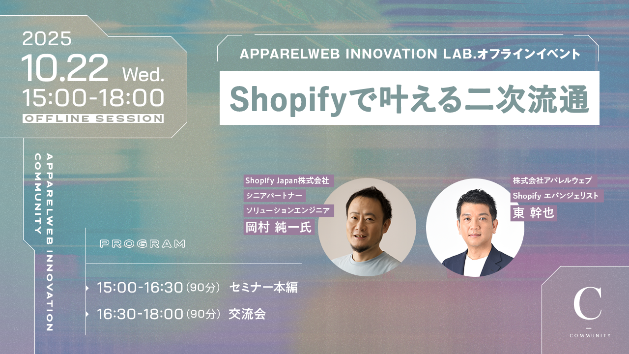 10月イベントテーマは、「Shopifyで叶える二次流通」です。近年、ファッション・小売業界ではリユースやリセールを中心とした二次流通市場が急成長しています。持続可能な消費の実現やブランド価値の維持が求められるなか、その実装を支える基盤として注目を集めているのが、Shopify(ショッピファイ)です。本セミナーでは、Shopifyの最新機能や技術動向をはじめ、国内外の二次流通市場の現状と課題を解説。さらに、海外での成功事例を交えながら、Shopifyの実装方法や成功のポイントを紹介していきます。ブランドや小売事業者のEC担当者の方にとって、持続的な成長戦略としての二次流通の可能性を具体的に描ける機会となります。