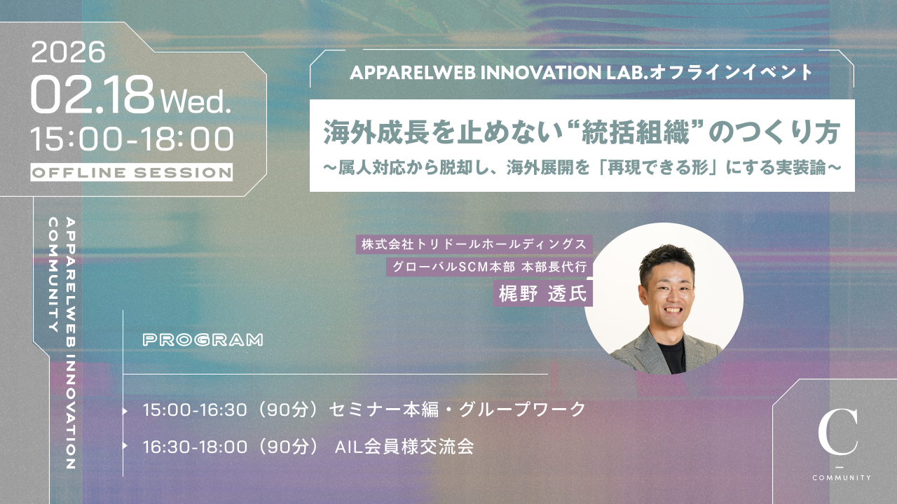 アパレルウェブ・イノベーション・ラボ(AIL)では、イノベーターや有識者を招きビジネスインプットを叶えるリアルセミナーと、会員様同士が気軽に情報交換・名刺交換いただける交流会を定期開催しています。