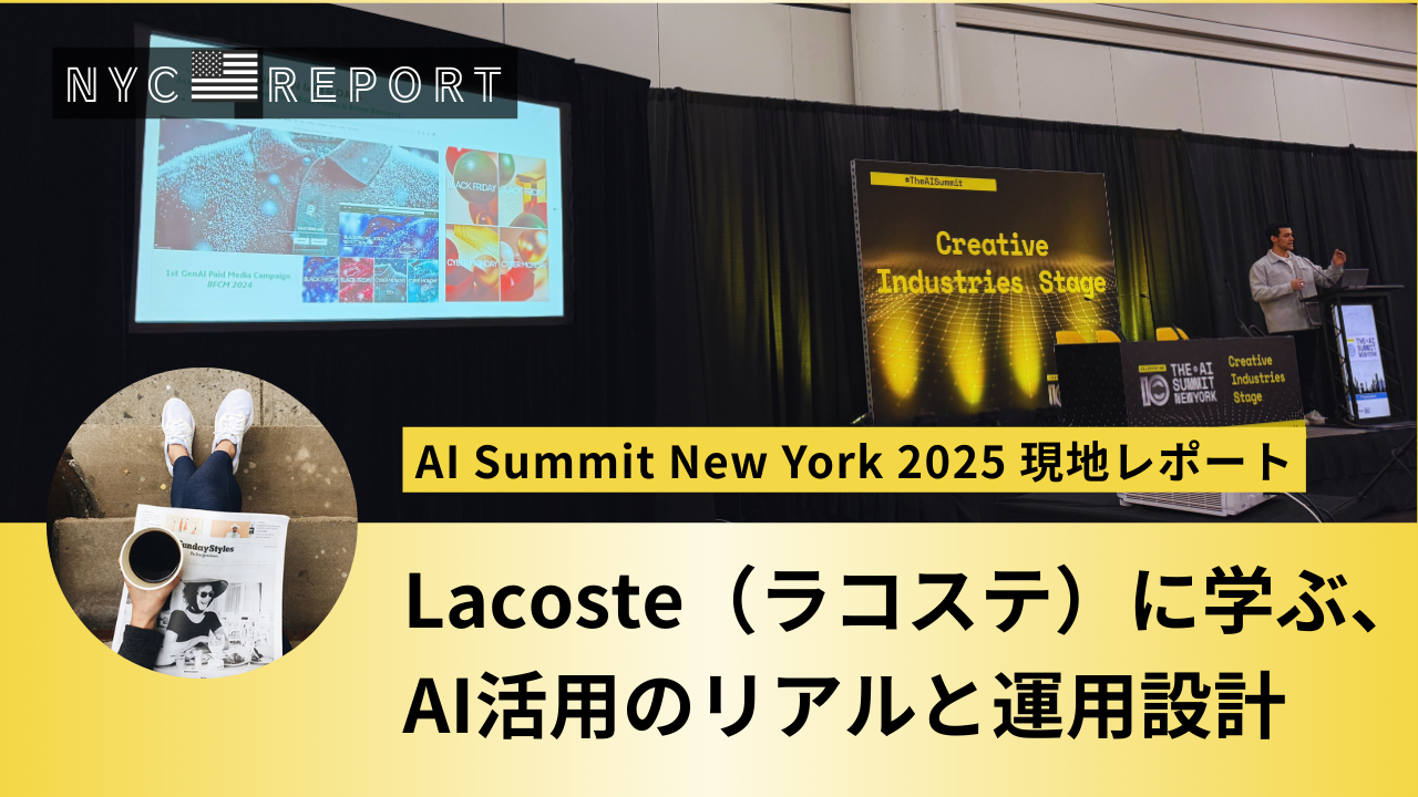 「AI Summit New York(AIサミット・ニューヨーク)」で語られた「Lacoste(ラコステ)」による実践的AI活用を現地取材。業務効率化とコンテンツ制作の二軸のAI戦略で、1日でキャンペーンを完成させる運用設計や、コスト削減・エンゲージメント改善を実現しています。また、グローバル展開を支える人材投資やスケーラビリティに関する企業成功例も交えてレポートをお届けします。