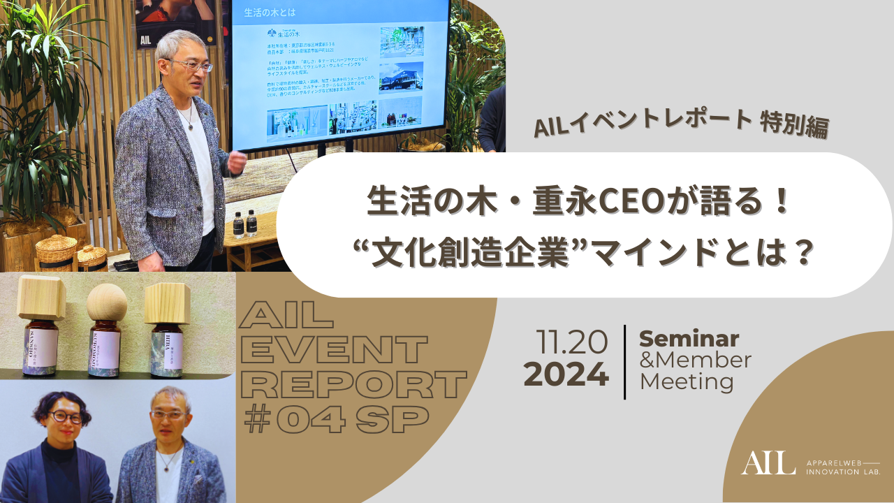 アパレルウェブ・イノベーション・ラボでは、イノベーターや有識者を招きビジネスインプットや“発見”をお届けする会員向けリアルイベントを定期開催。本企画では、イベントで得られたナレッジや交流会の様子をAIL編集部がレポートしていきます。