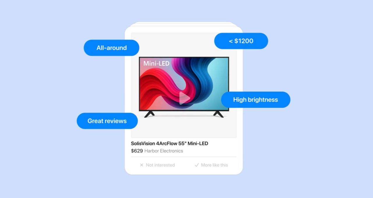 同機能では、「300ドル以下のドレスを探している」「特定の人物へのプレゼント」といった質問を入力すると、予算、サイズ、優先事項などの条件がクイズ形式で提示され、ユーザーの選択・回答に基づいて、推奨商品や購入ガイドが生成されます。気に入った商品はスワイプで保存できるなど、インタラクティブな操作性も特徴です。