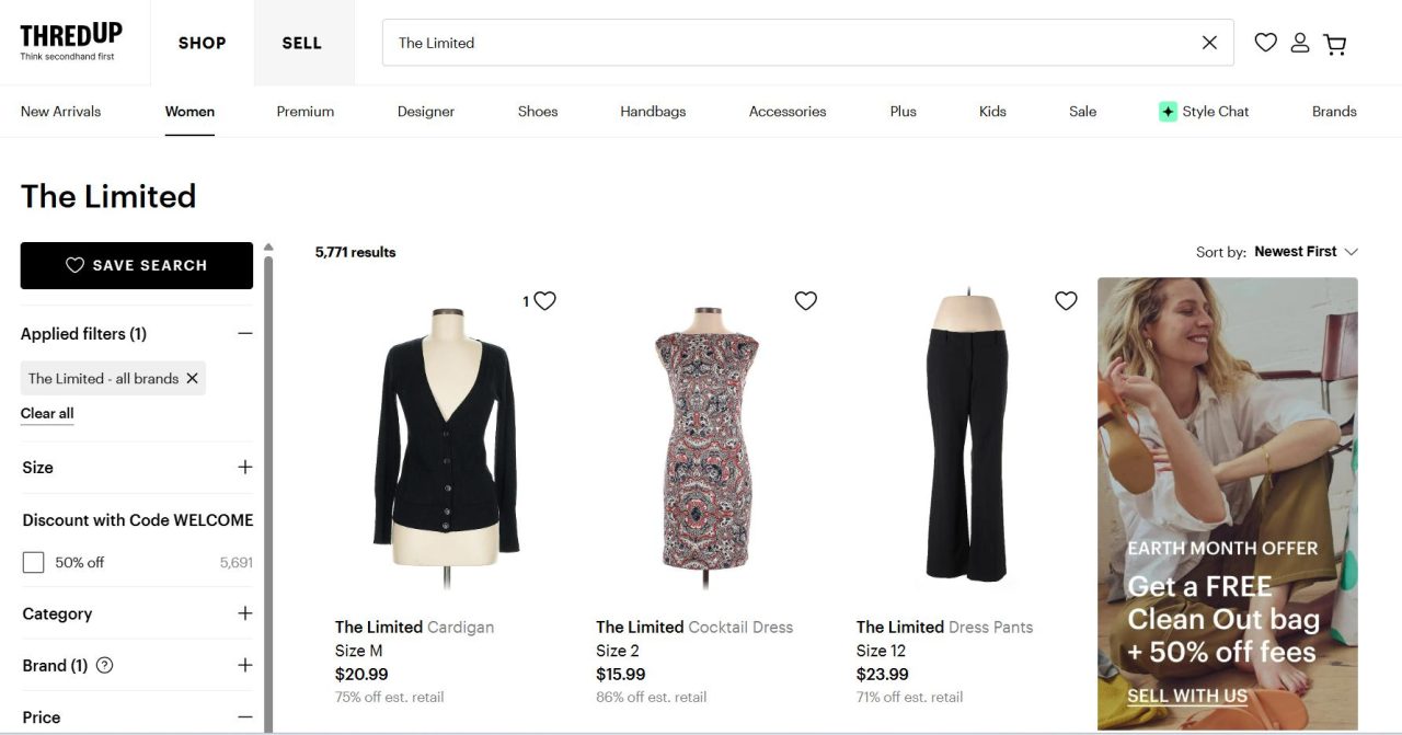 「ThredUP」では約5,700点の「The Limited」の中古品が再販されている(「ThredUP」公式オンラインより)