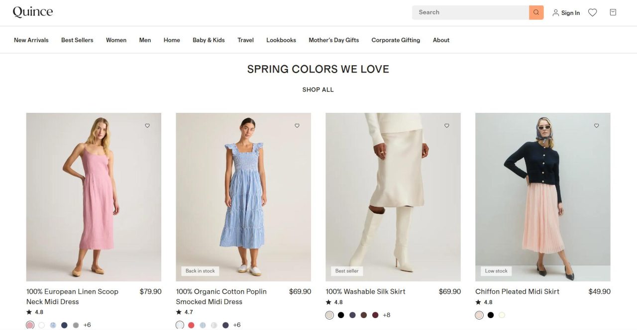 リネン、オーガニックコットン、シルクなど上質な素材のアイテムが手頃な価格帯で並ぶ「Quince」(公式サイトより)