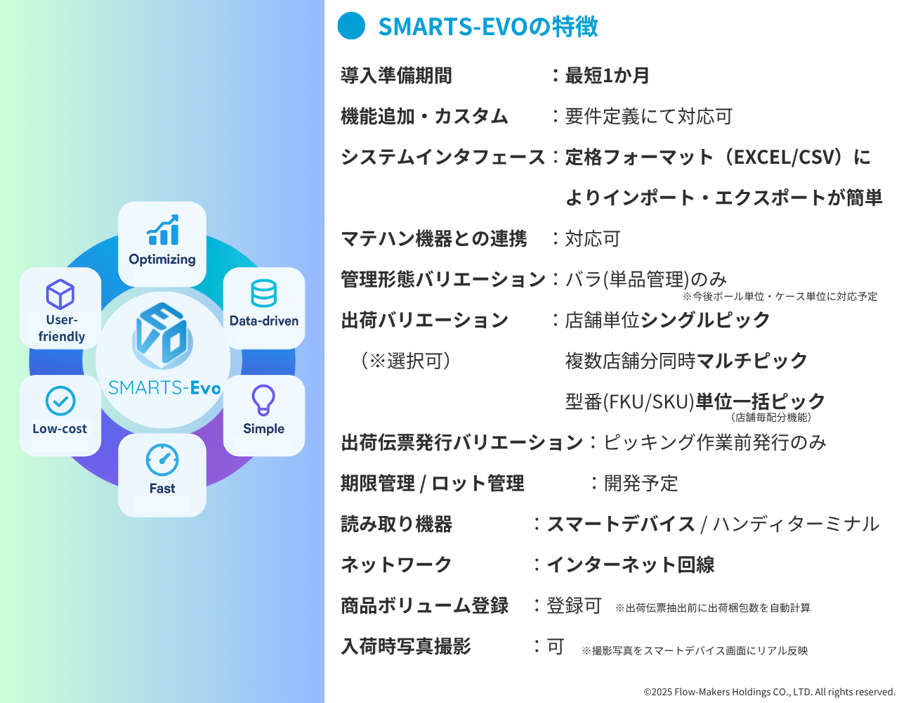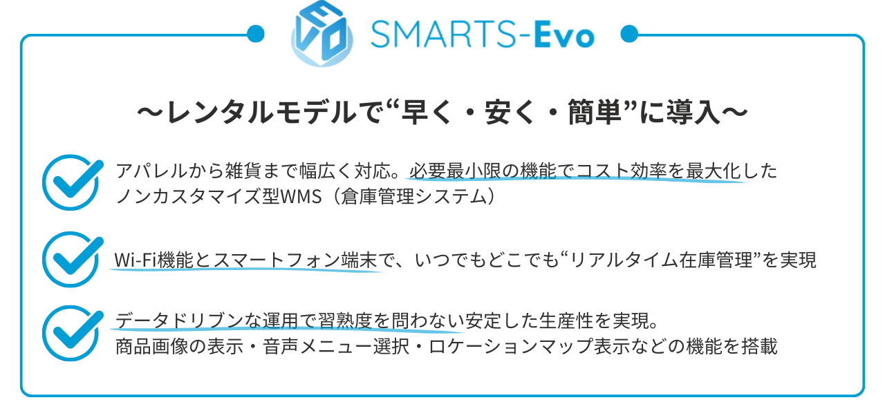 近年、アパレル業界では市場の縮小に加え、D2Cブランドやインフルエンサーによる小規模ブランドの立ち上げが増え、業界構造や消費者ニーズはますます多様化・細分化しています。こうした中で「物流面のコストハードルや人手不足を解消し、より手軽に導入できる選択肢」として誕生したのが、2024年にリリースされた「SMARTS-EVO(スマーツエボ)」です。