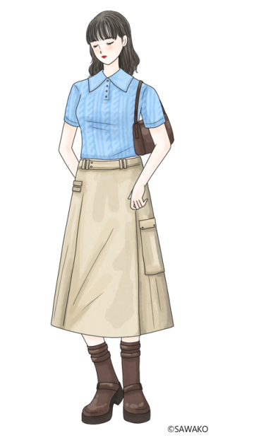 ミドル丈の「プリーツスカート」が人気です。中でも、ミリタリー調でありながら、きれいめとカジュアルを両立できる汎用性の高さが、売れ筋の要因となっています。「ラップスカート」のようなデザインのサイドプリーツもポイントで、縦ライン効果によりスタイルアップが叶います。同時に、素材の軽やかさが動きに表情を与え、通勤から休日まで幅広いシーンにおいて活躍。シンプルながら上品さを備えたデザインは、きちんと見えを重視する顧客に支持されています。
