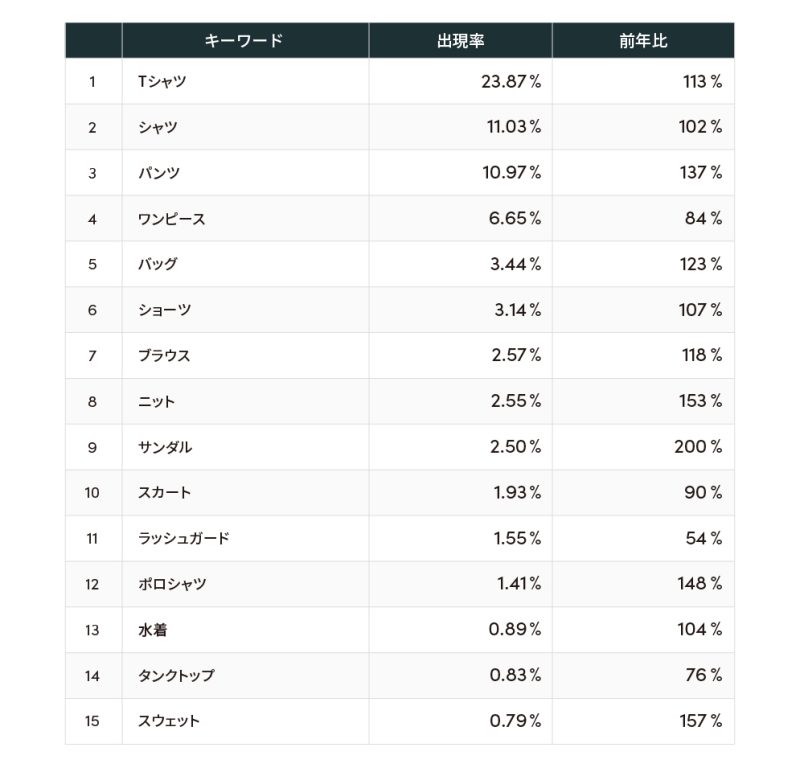 対象ブランド(駅ビル&SCグレードのカジュアル&コンテンポラリーブランド)のアイテムキーワードランキングを見てみましょう。「Tシャツ」の構成比の高さが続いています。すでに前年から進んでいた“夏と冬の二季対応”ですが、機能付加アイテムや買い替え需要などにより、「Tシャツ」は伸び代があることがわかります。一方で、前年に躍進した「ラッシュガード」は今年度の売上が半減しており、急速に普及した結果の揺り戻しともいえそうです。