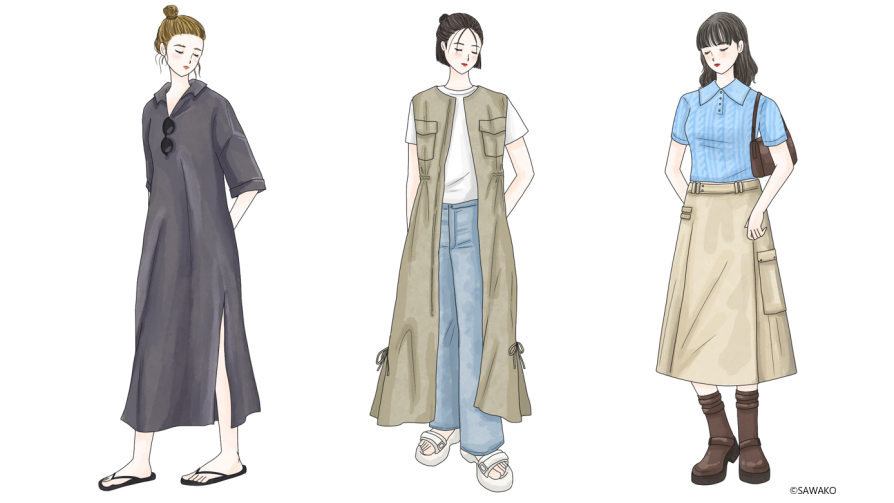 酷暑対応とトレンド転換を背景に、「スキッパーワンピ」が急伸しました。首元を涼しく、かつ抜け感を演出できるデザインは、「Tシャツワンピ」に代わる新鮮さを与えてくれます。体型を選ばないゆったりとしたシルエットや、サイドスリットの入った軽快なアイテムが支持を集めています。さらに、一枚で着映えしながらも、サンダルやスニーカーで着回せる汎用性が、夏の旅行やレジャー需要と合致しました。シンプルで実用性の高い服を求める時代性と季節性にマッチしたことが売れ筋の要因といえそうです。
