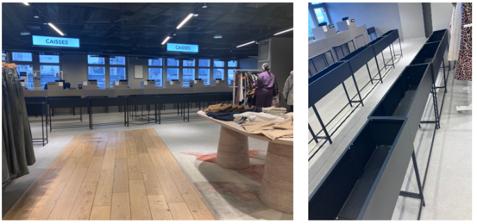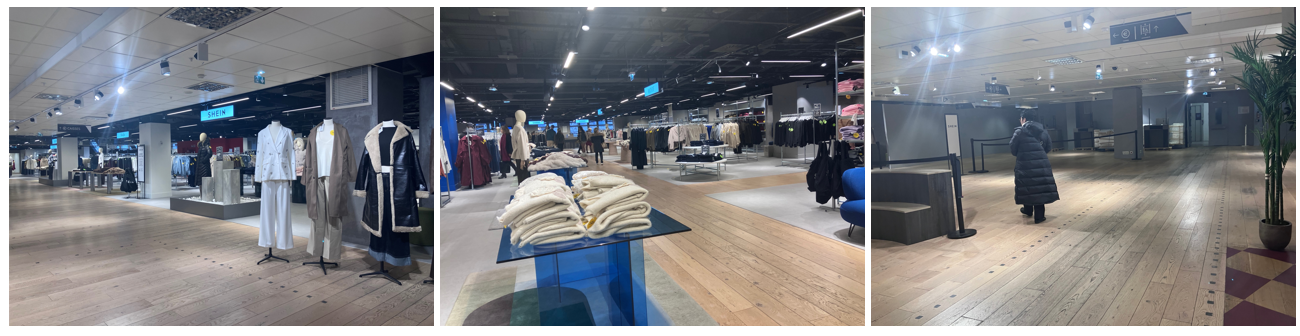 撤退したブランドもある一方、大半のブランドは出店を継続しており、BHVの売場全体としては顧客への影響は限定的であることがうかがえます。現時点では、テナントの空きが目立つような状況には至っていません。BHVの6階フロアの大部分が「SHEIN」の売場として展開されていますが、内装や什器は非常にシンプルです。フロアの一部では装飾のない空間も見られ、全体として即席でオープンしたような印象を受けました。また、アクセサリーなどの小物商品の展開はほとんどなく、会計レジの周辺に設けられることが多い雑貨・小物類のディスプレイスペースも空の状態となっていました。