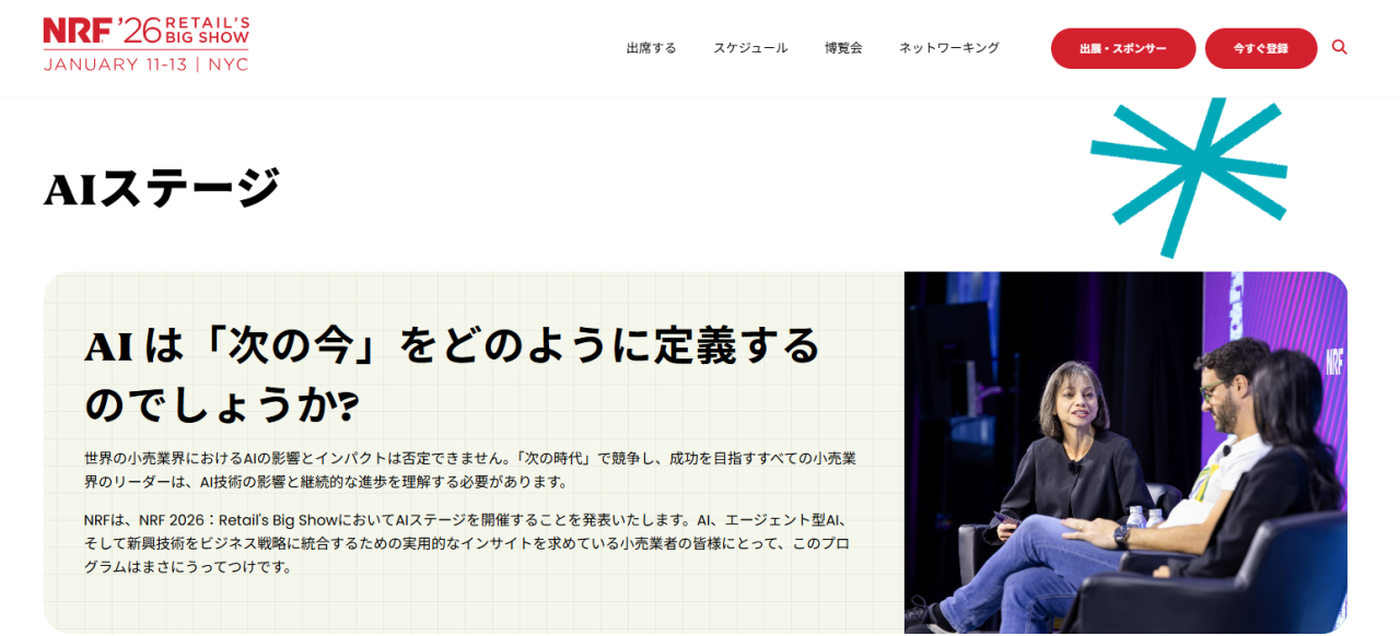 これらに加え、2026年の大きな特徴として、AIに特化した新たなステージ「AI Stage(AIステージ)」 が設けられています。小売業におけるAIの未来、とりわけAIエージェントの可能性を深く探るプログラムが展開される予定です。これはNRFが、AIを“次に来るもの”ではなく“いま取り組むべきテーマ”と捉えていることを示しています。