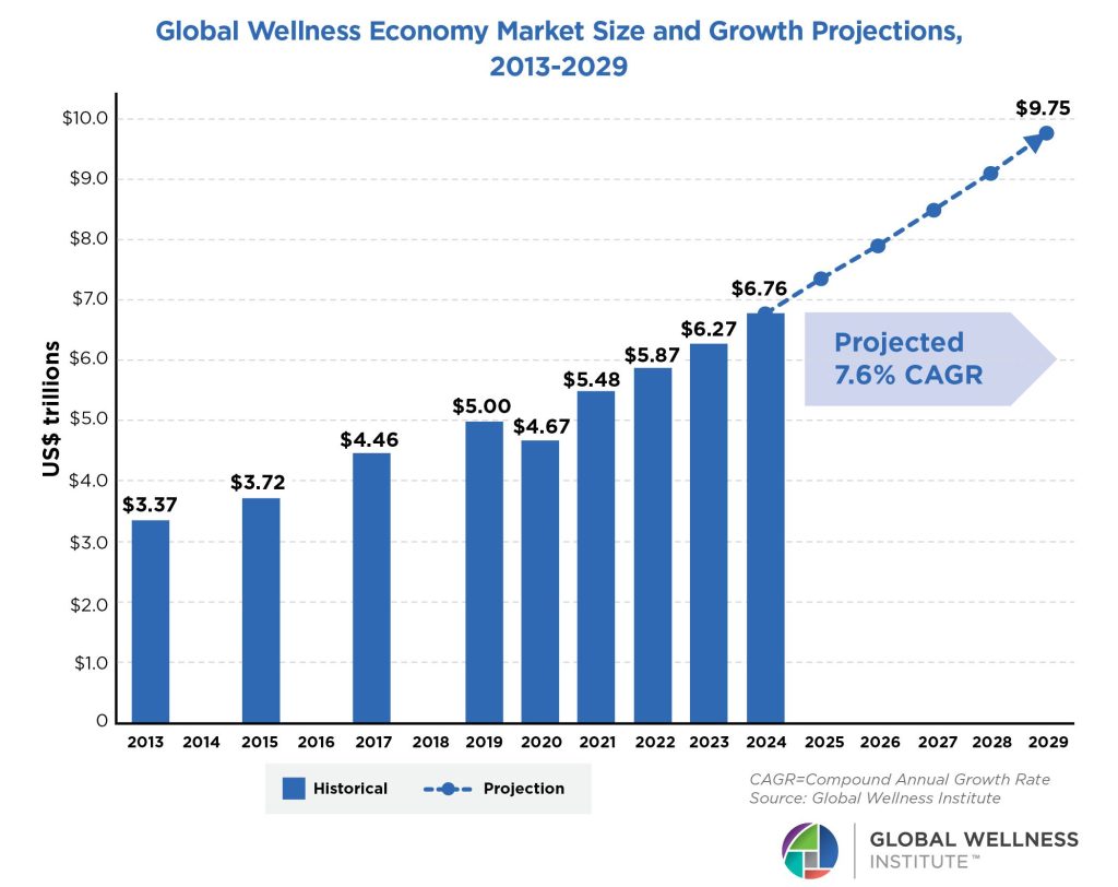 2013年‐2029年の世界ウェルネス市場規模成長(出典:2025 GWI Figure-1.2)